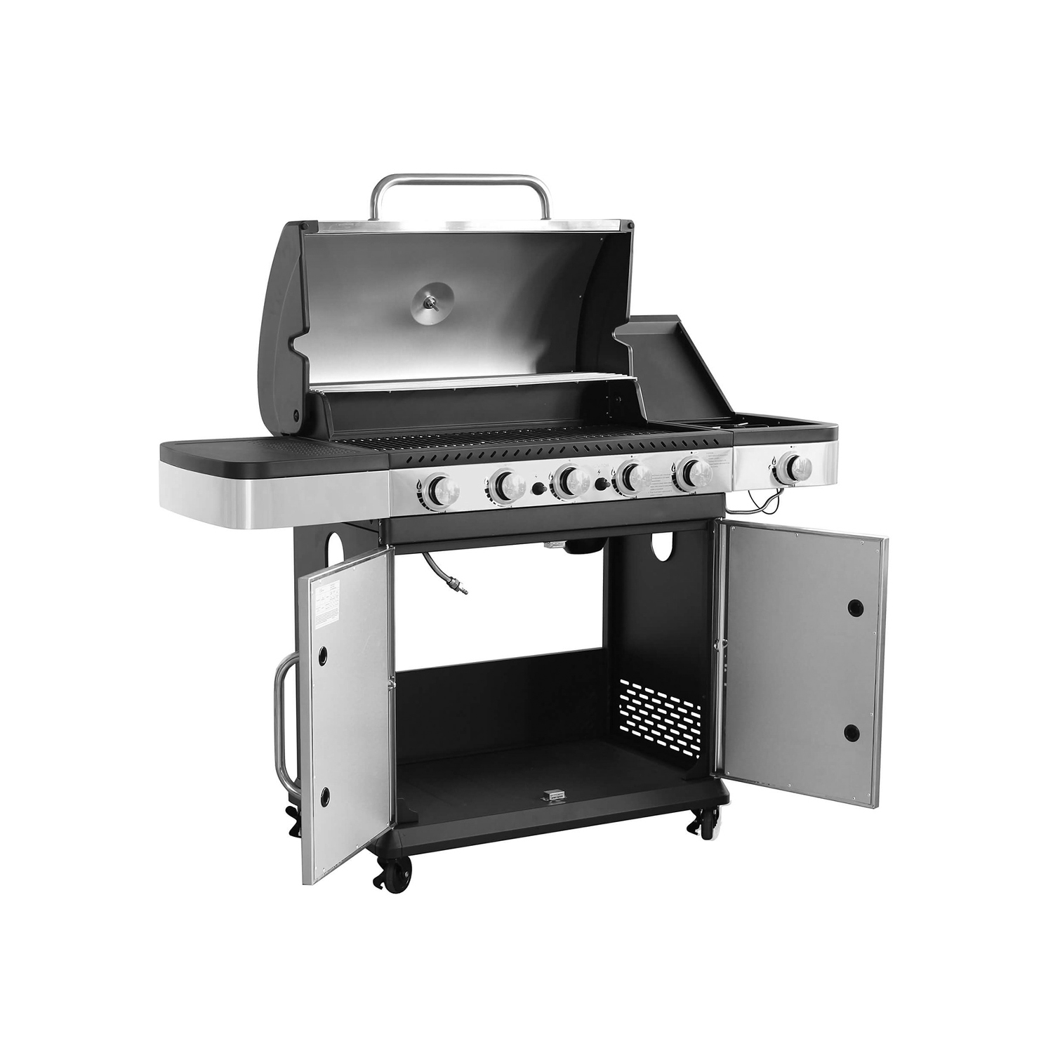 Se hai a disposizione uno spazio esterno adeguato, il barbecue è l'elemento perfetto per trasformare terrazzi e giardini di casa in angoli di pura convivialità gustando specialità alla griglia. Realizzato in acciaio inox, è dotato di un piano cottura a 5 fuochi e di un comodo fornello laterale con sistema di accensione automatica. La griglia in acciaio ha dimensione 82x42 cm ed è ideale per cuocere e grigliare carne, verdure e pesce, include un piano d'appoggio laterale con vaschetta per agevolare la preparazione delle vostre pietanze. Nella parte inferiore, sotto i fornelli, è caratterizzato da un comodo vano con chiusura a doppio sportello per riporre gli accessori utili per il vostro barbecue. Il sistema a 4 ruote permette di spostarlo e posizionarlo in tutta facilità. Funziona solo con GPL. Bombola non inclusa.