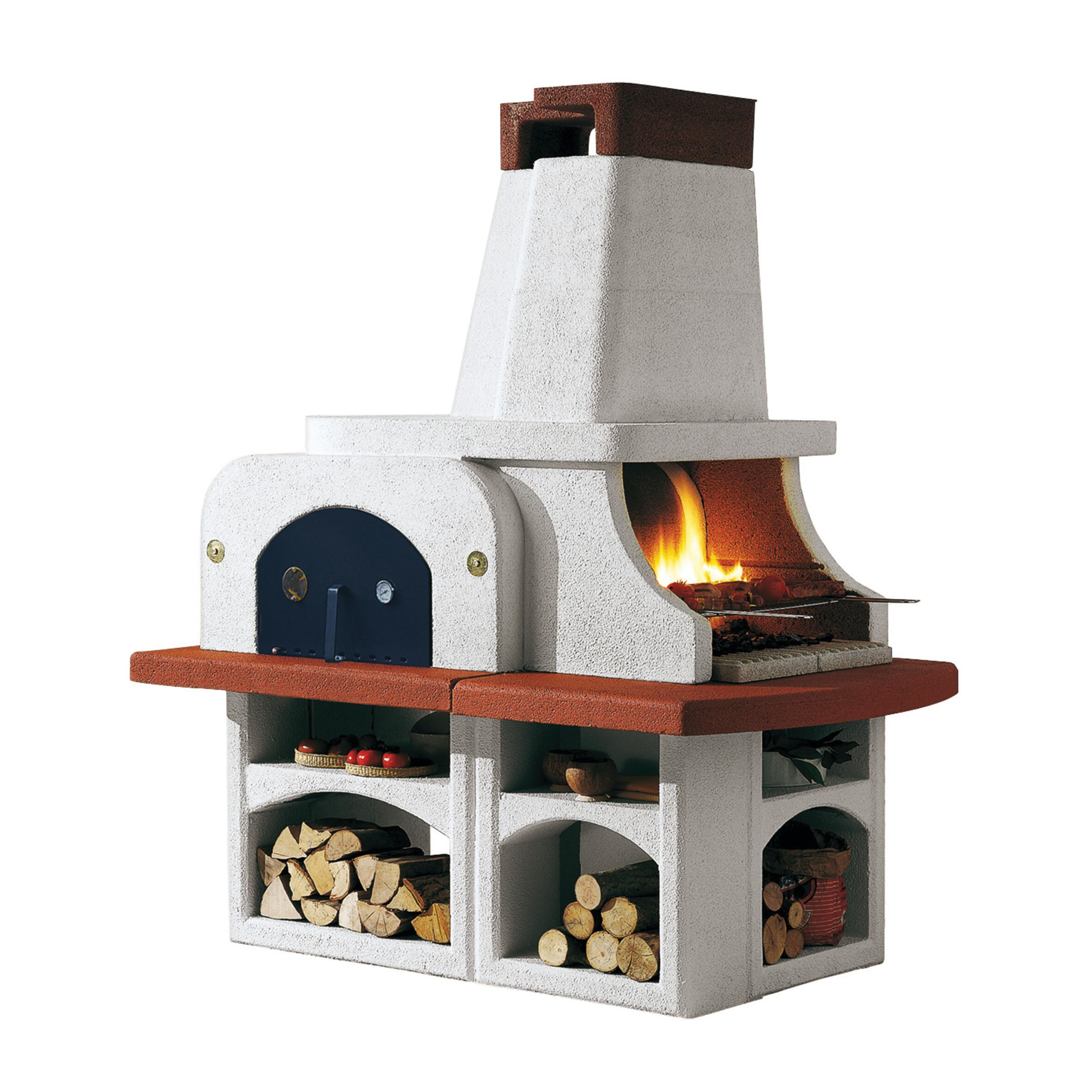 Dimensioni L 179 x H 207 x P 110 cm, in cemento. Ideale per 6 persone, da utilizzare con legna o carbonella. Ampio forno in cemento refrattario ideale per pane, pizze e arrosti. Forno a legna con porta, termometro e regolazione dell'aria. Abbondanti spazi per riporre legna e accessori. Griglia regolabile su 2 altezze