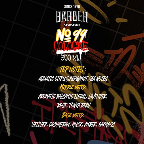 BARBER Cologne No.99 Special Edition 500 ml: questo design in cui si uniscono note fresche e speziate, ti porterà in momenti felici in cui inalare l'odore fresco del mare e l'energia dello stile graffity. Bergamotto e profumo di mare ti mettono sempre in uno stato d'animo calmante e rilassante. Sentirai l'intensità delle note muschiate e ambra. Grazie al suo profumo vivace, darà sempre una sensazione di pulizia e sollievo.