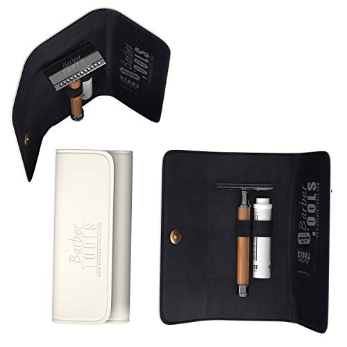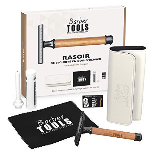 BARBER TOOLS - Rasoio di sicurezza in Legno + 5 lame doppie + panno per lucidatura + custodia per il trasporto
