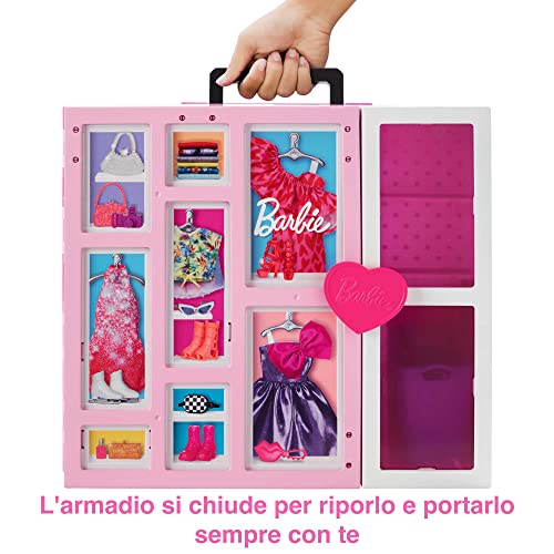 L'Armadio dei sogni di Barbie include una bambola Barbie e si apre per rivelare uno spazio gioco largo più di 60 cm, con oltre 15 punti per riporre gli accessori, un secondo piano con area appendiabiti a comparsa, una buchetta per la biancheria, uno specchio a figura intera, una scrivania e oltre 30 abiti e accessori.