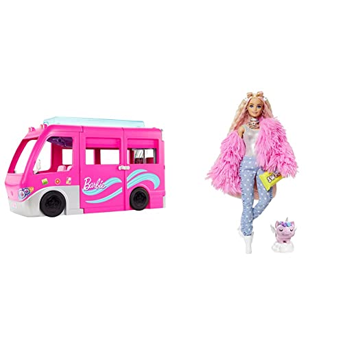 Barbie Camper dei Sogni - Veicolo con Scivolo e Piscina - 2 Cuccioli - 7 Aree Gioco - Alto 76 cm 60+ Accessori - Regalo per Bambini 3+ Anni & Extra n.3 - Bambola Snodata con Pelliccia Rosa e Maialino