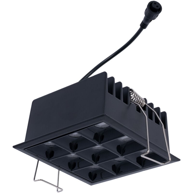Downlight LED quadrato da incasso in colore nero, composto da nove faretti da 18W in totale. Incorpora chip LED Osram e driver KeGu. Si distingue per il suo basso indice di abbagliamento (UGR