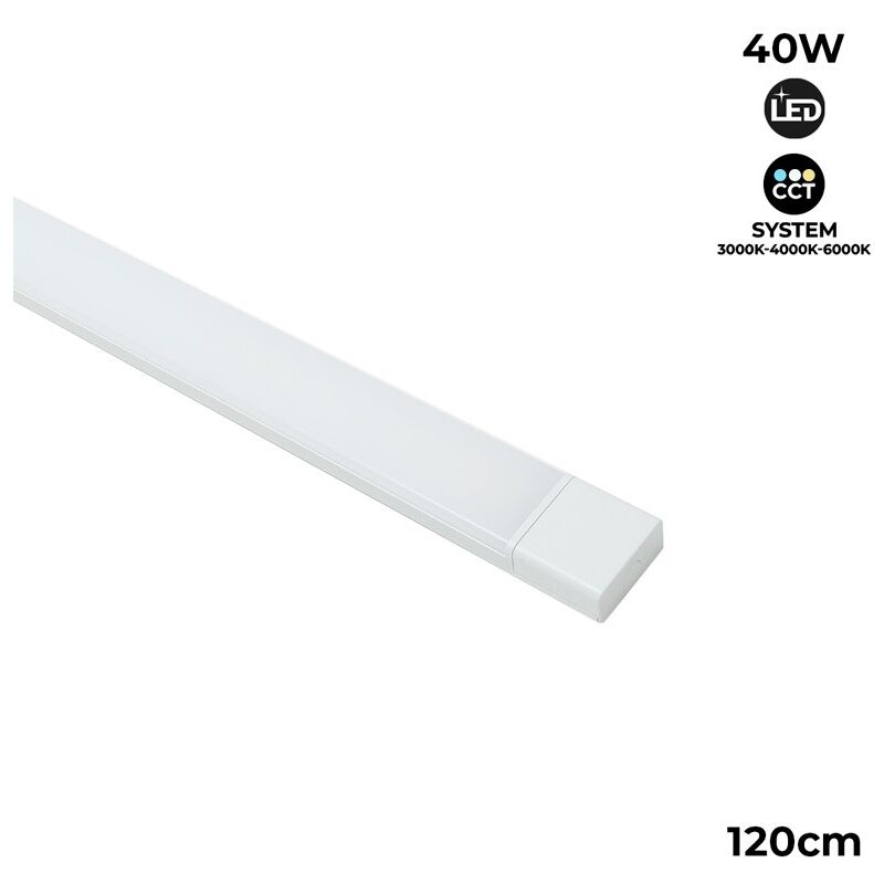 Lampada lineare a LED ad alta potenza lungo 120 cm, ideale per sostituire i tradizionali tubi fluorescenti, in quanto unisce la qualità a un notevole risparmio energetico. Ha una potenza di 40W e fornisce una grande quantità di luminosità distribuita in modo omogeneo grazie al suo diffusore opalino. Incorpora il sistema CCT, che consente di modificare la temperatura di colore tra tre diverse tonalità: bianco caldo (3000 K), bianco neutro (4000K) e bianco freddo (6000K), mediante un selettore posto internamente. **Incluse viti e set di graffe metalliche per il fissaggio**