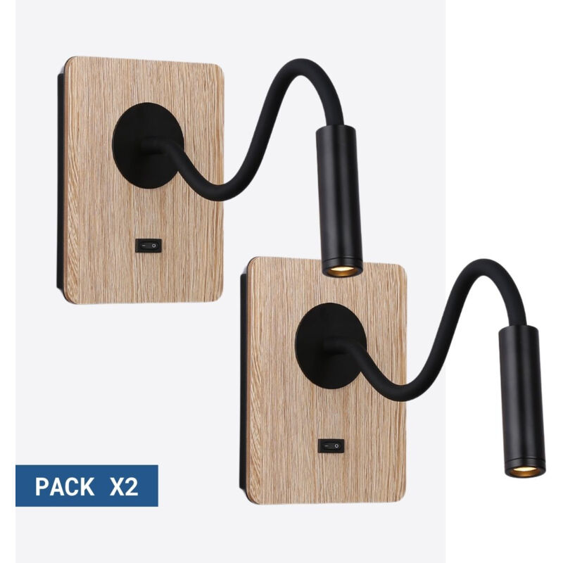 Confezione x 2 - Applique da lettura flessibile LONDON L'applique da parete LONDON è stata appositamente progettata come lampada da lettura per la testata del letto. È dotata di un braccio flessibile regolabile e di un faretto LED da 3W. Emette una luce bianca calda (2800K) con un flusso luminoso di 450 lm. Si distingue per le finiture di alta qualità e per il tocco caldo dato dal legno. Disponibile in nero.