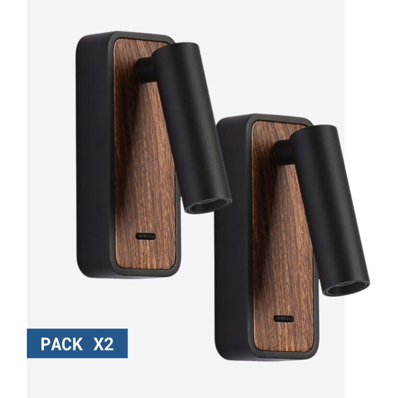 Confezione x 2 - Applique da lettura Irene Lampada da lettura orientabile da collocare sulle testate dei letti, con un design elegante che aggiunge stile e funzionalità allo spazio. Include un faretto LED da 3W che può essere orientato in base alle proprie esigenze. Offre una luce piacevole in una tonalità bianca calda (2700K) per creare un'atmosfera accogliente e confortevole nello spazio di lettura o di riposo. Disponibile in nero con color legno.