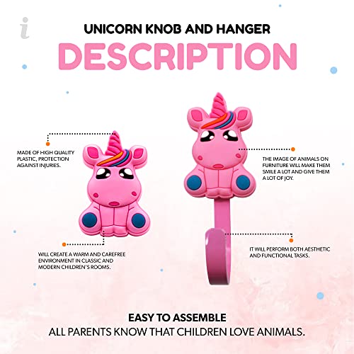 DOJA Barcelona | Pomelli per Mobili Bambini + Appendi Abiti Bambini | 8 Pomelli Bambini e 8 Attaccapanni Bambino Unicorno | Pomello per cassetto | Ganci da Parete | per Cameretta, Cassettiera, Armadio