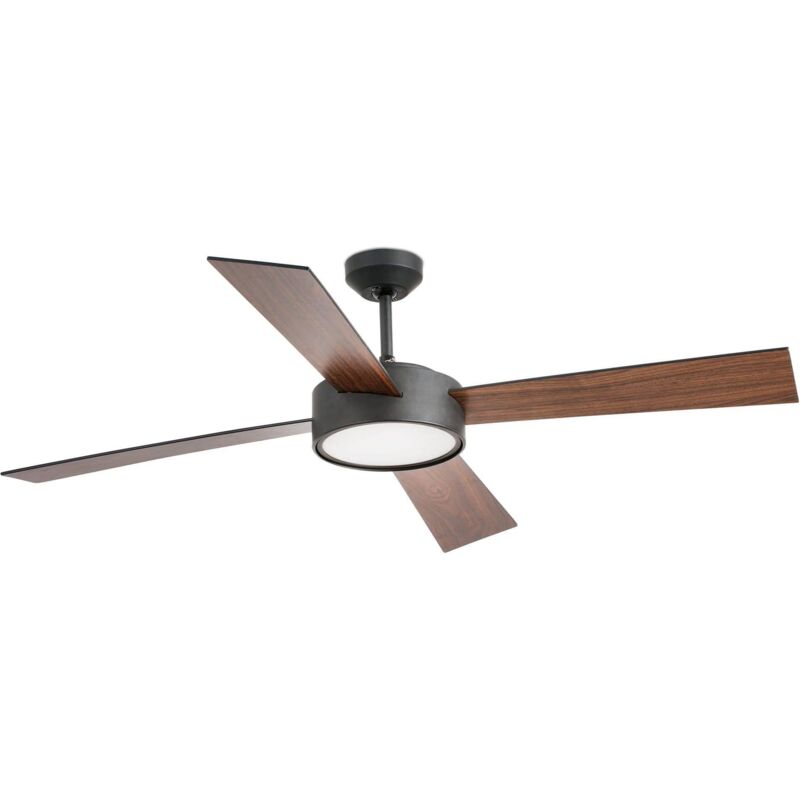 Ventilador de techo modelo HYDRA de la marca FARO con luz. Tiene un motor DC con una potencia máxima de 22W y 6 velocidades: 5-7-10-13-18-25 W / 99-116-134-154-172-193RPM. Se acciona mediante mando a distancia. . El cuerpo es de acero color negro mate, cuenta con 4 palas de plywood de color nogal oscuro y negro y tiene un diámetro de 1330 mm. El difusor es de ABS. Este ventilador incluye una fuente de luz SMD LED 3000K 1200 Lm. Tiene la posibilidad de reemplazar la tija por una tija de extensión de diferente tamaño. Es apto para instalar en un techo inclinado de hasta 30°. Este ventilador no es apto para exterior. Este ventilador dispone de función inversa, también llamada función verano-invierno, que consiste en el accionamiento del ventilador en sentido inverso para optimizar el uso de la calefacción en invierno.