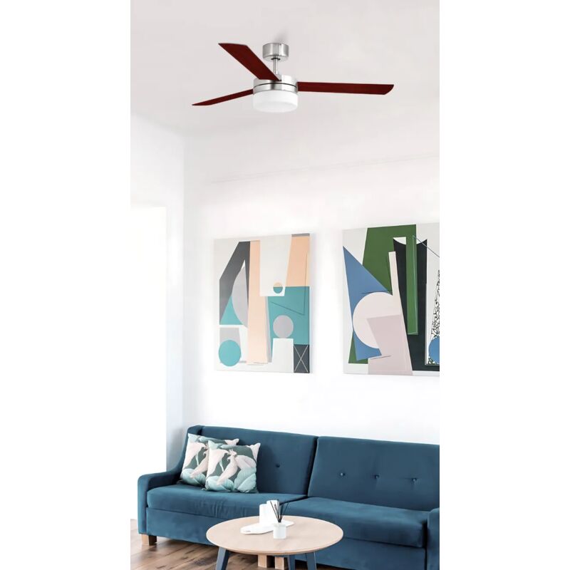 Ventilador de techo modelo PANAY de la marca FARO con luz. Tiene un motor AC con una potencia máxima de 8W y 3 velocidades: 14-30-58 W / 95-150-200RPM. Se acciona mediante mando a distancia. . El cuerpo es de acero color niquel mate, cuenta con 3 palas de MDF de color niquel mate y caoba y tiene un diámetro de 1220 mm. El difusor es de cristal. Este ventilador es compatible con una fuente de luz E14, no está incluida. Tiene la posibilidad de reemplazar la tija por una tija de extensión de diferente tamaño. Es apto para instalar en un techo inclinado de hasta 30°. Este ventilador no es apto para exterior.