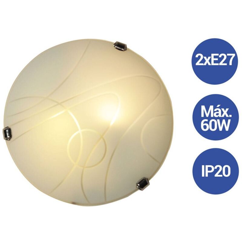 Lampada da soffitto o da parete in vetro moderno. Design rotondo, moderno ed elegante. Con linee sottili sul coperchio di vetro. Può essere aggiunto ovunque in ambienti interni. Coperchio in vetro smerigliato traslucido, a forma di luna. Il coperchio di vetro è tenuto in posizione da tre alette metalliche. Due prese E27 con una potenza massima di 60W, ogni lampadina E27. Dimensioni Ø300X80mm. **LAMPADINE E27 NON INCLUSE**. 230V/AC 2xE27 Ø300X80mm IP20