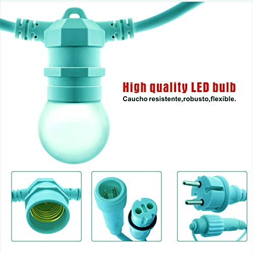 Esterno e interno: la catena è rinforzata per uso esterno, sia in prese, connessioni e prese, con un grado di protezione IP65, che impedisce l'ingresso di acqua, polvere e sporco nelle parti elettriche. Ideale per patio, giardino, caffè, capannoni, decorazioni natalizie, matrimoni, decorazioni, stanze, soggiorno, sala da pranzo.