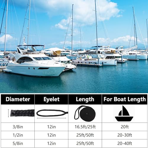Dimensioni: lunghezza: 5,7 m, 1,5 m, diametro: 0,9 cm, 1,27 cm, 1,5 cm. Resistenza alla rottura: 1814,4 kg/2,222,6 kg/2,540 kg. Le linee di ancoraggio in nylon nero possono proteggere la tua barca al sicuro nel molo qualunque sia il tempo!