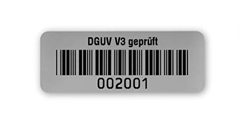 Etichette di prova DGUV V3, testate, 40 x 15 mm, argento opaco, stampate con codice a barre a 6 cifre, codice 39 senza numero di prova per tutti i comuni dispositivi di prova con scanner. Codice a cerchio 002 001..003 000
