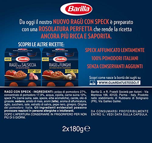 Barilla Ragu Con Speck, con Speck Affumicato, Sugo Pronto dal Gusto Ricco e Corposo, 2x180 g