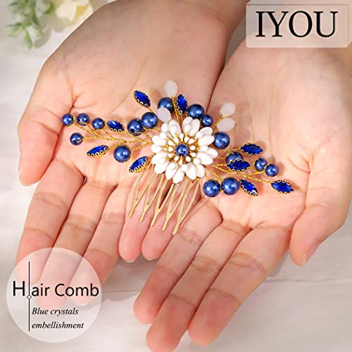 IYOU Barocco Nozze Pettini per Capelli Blu Fiore Lati del Pettine per Capelli Perla Copricapo Festa Sposa Accessori per Capelli per Donne
