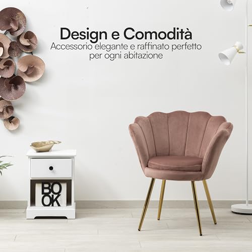 Baroni Home Poltrona Imbottita con Schienale a Conchiglia in Velluto Cipria con Gambe in Oro, Poltrona da Salotto e Camera da Letto, Super Confortevole, Poltrona Relax 69x71x84 Cm