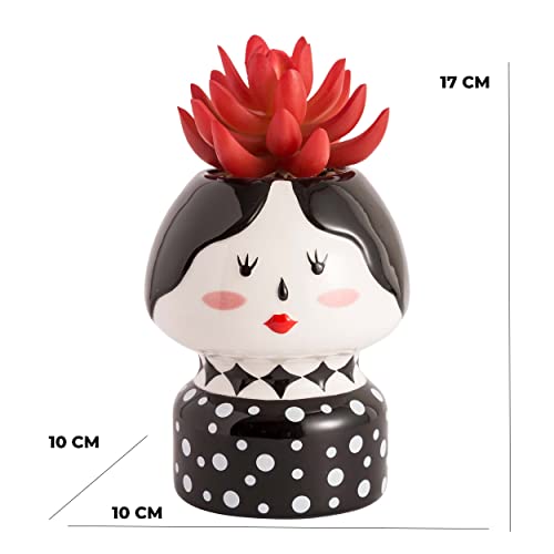 Baroni Home Vaso Testa in Ceramica con Volto, Vaso con Pianta Artificiale Inclusa, Soprammobile Moderno, Statuetta da Interno o Esterno 10x10x17 cm - Vestito Nero a Pois