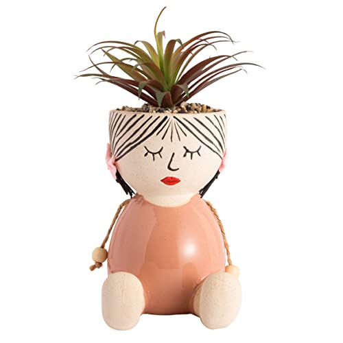 Baroni Home Vaso Testa in Ceramica con Volto, Vaso con Pianta Artificiale Inclusa, Soprammobile Moderno Dipinto a Mano, Statuetta da Interno o Esterno 16x13x18 cm - Bambina Seduta Grande