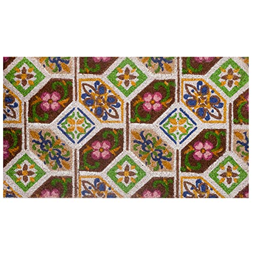 Baroni Home Zerbino da Esterno Ingresso Casa in Cocco Dipinto a Mano in Stile Siciliano 70x40 cm Facile da Pulire e Super Resistente, Mattonelle Verdi e Marroni