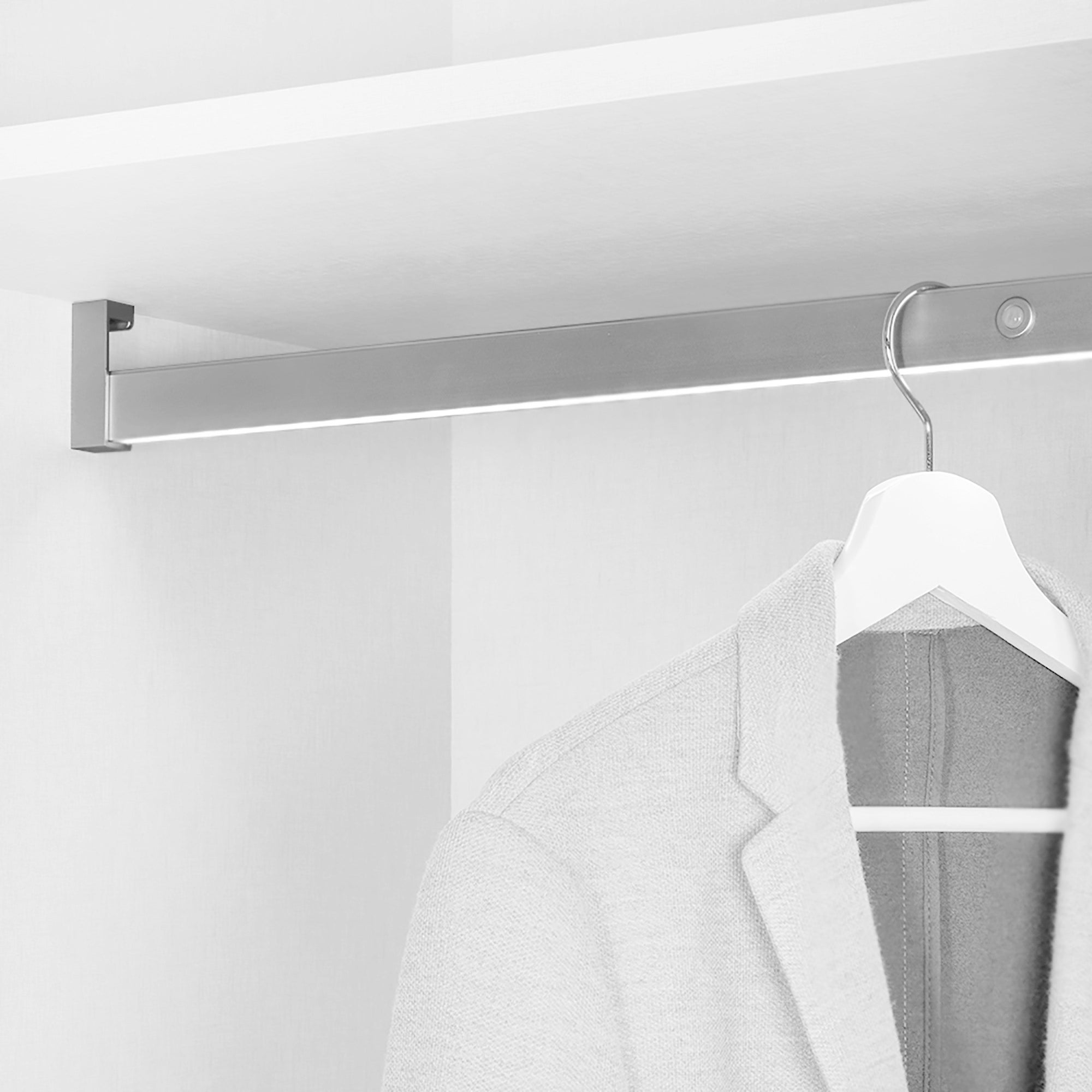 Emuca Barra appendiabili per armadi con luce LED, regolabile 858-1.008 mm, batteria rimovibile,sensore di movimento, Luce bianca naturale, Alumínio, Anodizzato opaco. Illuminazione LED con batteria,Barre d'armadio e appendiabiti. Illuminazione integrata,Organizzatori interni per armadio e cabine armadio. Sensore di movimento integrato che permette accendere la lampada avvicinandosi a meno di 1,5 metri e spegnere la luce 15 secondi dopo aver uscito dall'angolo di rilevamento.Alimentazione con batteria rimovibile, che può essere ricaricata da un caricabatterie di cellulare di 5V DC 1A con conettore micro USB tipo B (non compreso) senza necesità di smontare l'asta appendiabiti.Da installare in spazi interni di armadio tra 858-1008mm. L'asta appendiabiti può tagliarsi per aggiustarla a la misura interiore del mobile.Barra in alluminio anodizzato opaco con gomma in PVC semirigida per evitare il rumore delle gruccie.Instalazione senza fili molto semplice grazie ai reggitubi ed i viti di assemblaggio forniti.Rango di rilevamento del sensore: 1,5 metri.Ángolo di rilevamento del sensore: 90°.Numero di LEDs: 75. Temperatura di colore: Bianco naturale (4.000K). Flusso luminoso / Luminosità: 50 lm.Potenza: 1W.Angolo d'illuminazione: 120°. Grado di protezione: IP20.