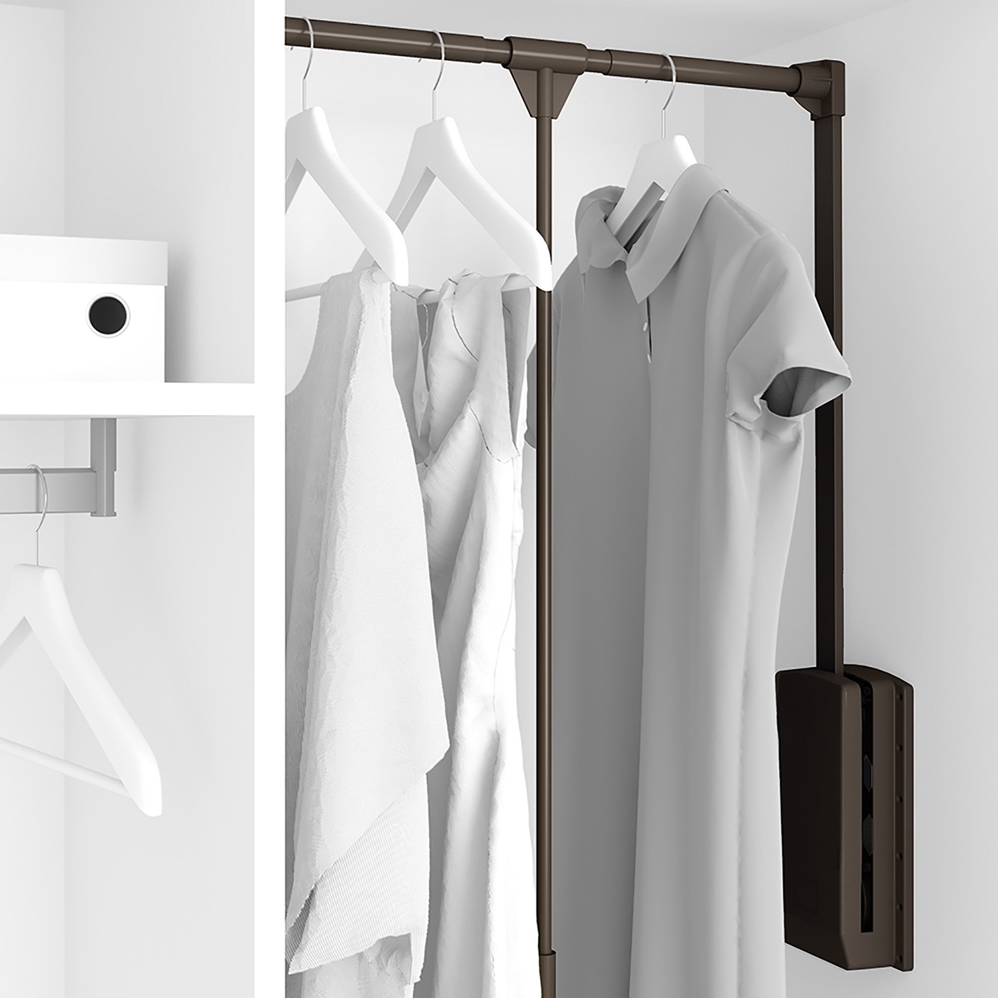 Emuca Appendiabiti saliscendi per armadio, larghezza regolabile 60-83 cm, fino a 12 Kg, Acciaio, Color moka. L'appendiabiti per armadio Hang permette di avere accesso alla zone più alte dell'armadio senza sforzo. La barra è regolabile in larghezza per essere adattata al vano utile dell'armadio, oltre ad avere un movimento dolce con ritorno ammortizzato ha una capacità di carico massimo di 12 kg. In caso di installazione sull'armadio con porte a battente si raccomanda il montaggio insieme agli spessori laterali Hang 9280313/9280325.. Larghezza telescopica 600-830 mm adattabile alle dimensione del vano interno dell'armadio. Carico massimo: 12kg. Per il montaggio sui fianchi lateriali del mobile. Finitura verniciata moka. Per il montaggio nell'armadio con porte a battente, istallare insieme agli spessori laterali cod. 9280313.