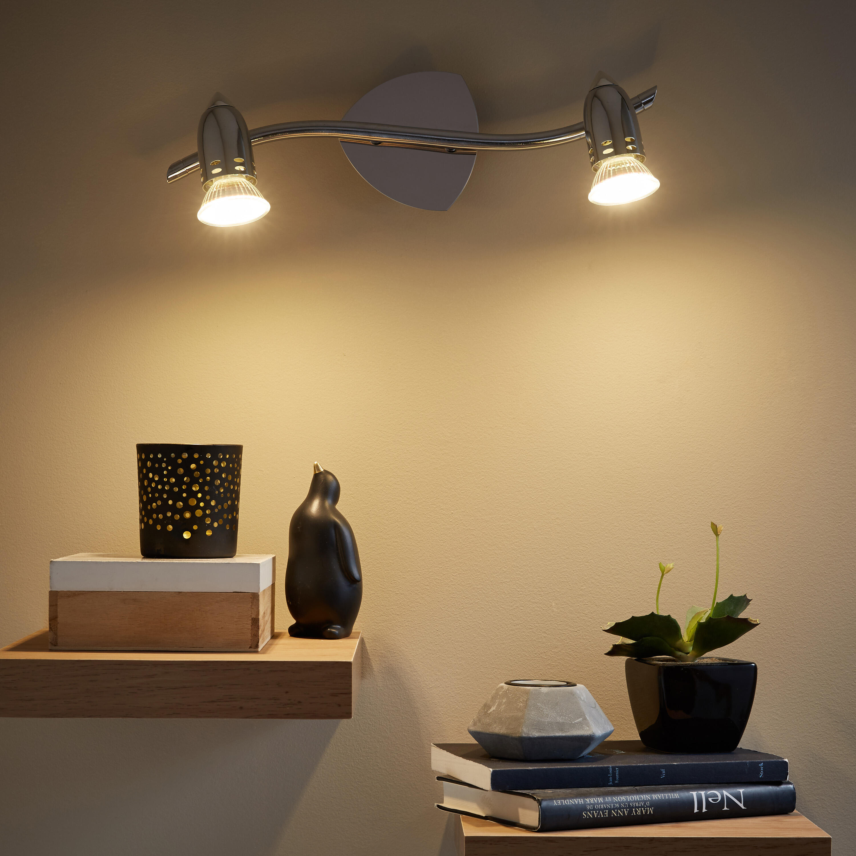Struttura in metallo finitura cromata, 2 lampadine non incluse, attacco GU10 a baionetta, wattaggio massimo 2x100 W