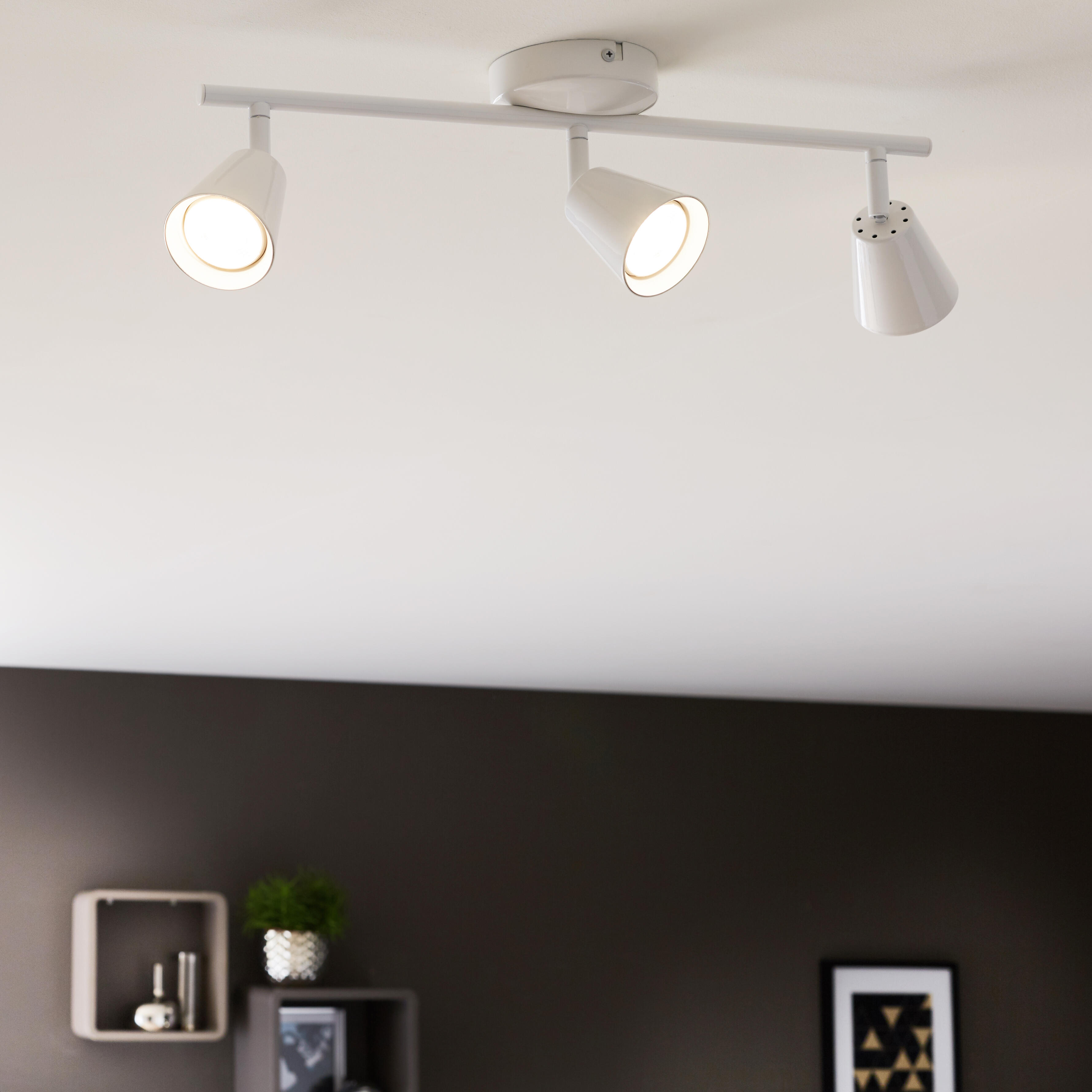 Struttura color bianco, diffusore in metallo, plastica colore bianco, 3 LED attacco integrato, 3.5 W, illumina come 19 W di una vecchia lampadina ad incandescenza. Consigliato per installazione a soffitto, puoi orientare facilmente la luce secondo le tue esigenze. LED integrato, massima efficienza e minimo consumo, 3.5 W
