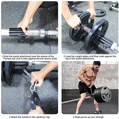 Facile da usare: si adatta sopra l'estremità della manica di una barra olimpionica. Basta farlo scorrere lungo la barra fino a quando non si appoggia contro il colletto della manica. Quindi aggiungere le piastre di peso. Fissare le maniglie al moschettone. Modificare la posizione di collegamento a scatto lungo la catena di estensione, o rimuovere la catena di estensione e collegare la maniglia a Landmine Single Eyelet utilizzando solo un collegamento a scatto.