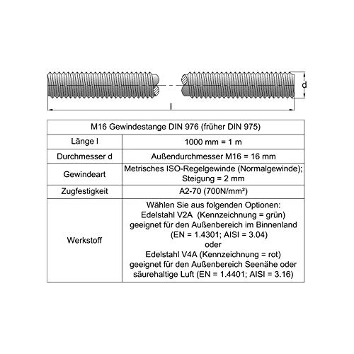 5 barre filettate M16, in acciaio inox, DIN 975 976, barra filettata VA V2A A2, 1 m