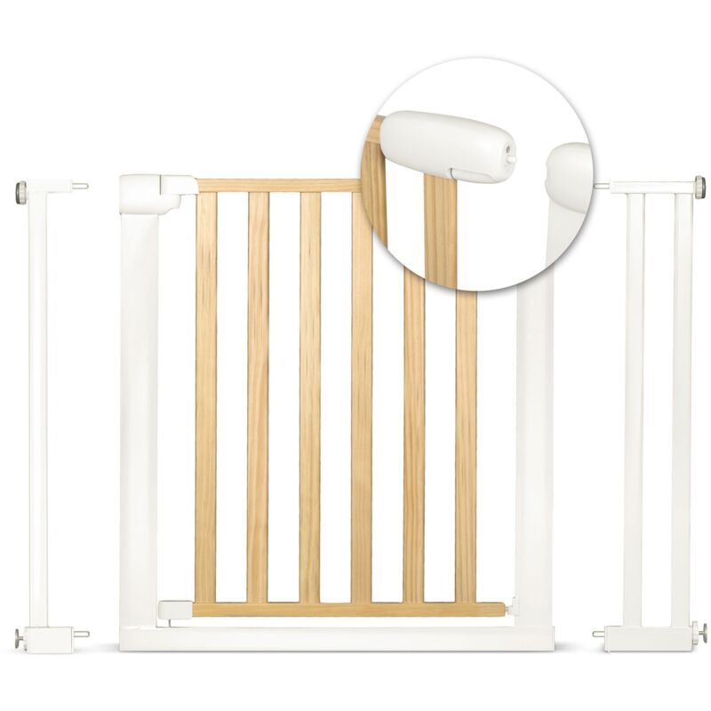 Cancello di sicurezza Nukido La barriera di sicurezza di Nukido viene montata con giunti di dilatazione senza la necessità di praticare fori: non danneggerai le pareti o il telaio della porta. La porta è realizzata con una combinazione di legno chiaro e acciaio bianco (colore bianco sporco), quindi si abbinerà agli elementi di design degli interni in legno. La larghezza regolabile ne consente l'installazione su porte e passaggi da 74 a 105 cm. Prenditi cura della sicurezza di tuo figlio Il tuo bambino impara ogni giorno cose nuove, per aiutarlo a esplorare il mondo in condizioni sicure vale la pena acquistare una barriera di sicurezza. Il cancello impedirà al tuo bambino di salire o cadere dalle scale. Non ti consentirà di entrare in stanze non protette. Si adatta alle vostre esigenze Grazie alla possibilità di espansione e al sistema di montaggio, il cancello può essere adattato a passaggi con dimensioni da 74 cm a 105 cm. Non è necessario cercare una barriera su misura. Basta usare