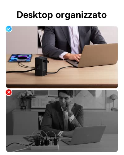 L'opzione migliore: 1 stazione di ricarica PowerCombo per più dispositivi corrisponde a una ciabatta elettrica con 5 porte, 3 caricabatterie USB e un cavo di ricarica rapida di tipo C da 65 W, che consente di risparmiare denaro e di mantenere la scrivania organizzata.