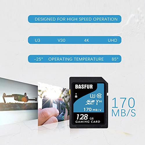 Basfur Scheda di memoria SD 128 GB, adatta per telefoni, computer, droni e altri dispositivi Android, trasmissione ad alta velocità 170 MB/s, A2 U3 V30
