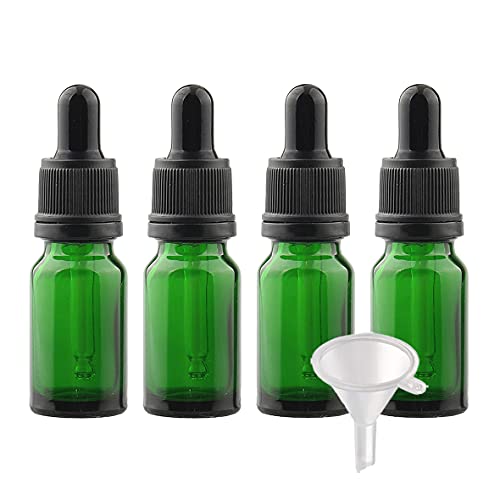 BasicPacking 4 Pezzi Verde Bottiglie Contagocce in Vetro 10 ml con Chiusura a Prova di Manomissione, Vuoto Flaconi con Pipetta Contagocce, per Olio Essenziale, Aromaterapia con Imbuti