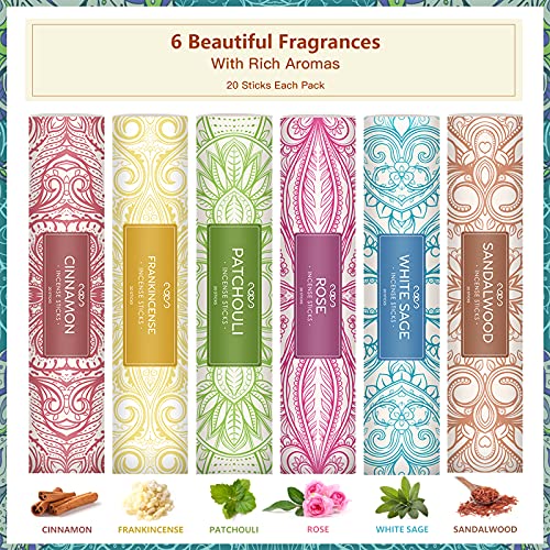 Bastoncini di Incenso, 120 Bastoncini Aromaterapia Set Regalo di Incenso, Con Supporto In Legno, Salvia Bianca, Cannella, Patchouli, Legno di Sandalo, Rosa