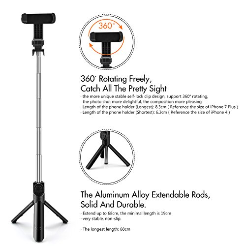 Bastone Selfie Bluetooth, AomTro Estensibile Selfie Stick Treppiede con Bluetooth remote shutter per iPhone X 8 Plus 7 Plus 6s plus se 5s Samsung Huawei e Smartphone 3.5-6 Inch, Rotazione di 360°
