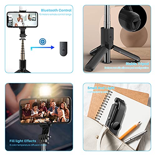 【Selfie stick con luce di riempimento】 Allunga il selfie stick e tieni premuto il pulsante sul lato della luce di riempimento per accendere la luce di riempimento. Ci sono 6 livelli di luminosità. Può aiutarti efficacemente a scattare foto chiare e perfette in condizioni di scarsa illuminazione o totale oscurità.