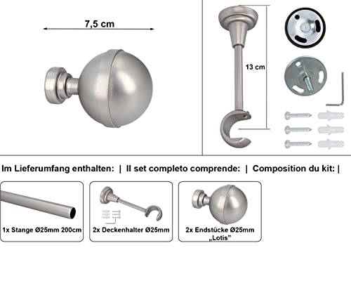 HDTL Kit Bastone per Tende in metallo 25mm Cromo Opaco Montaggio a Soffitto 200 cm Lotis