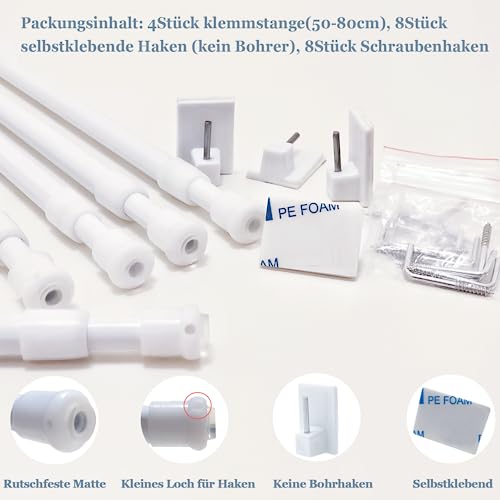 Bastoni per Tende a Pressione Aste per Tende Estensibili a Molla Pressione Bastoni Tende Regolabile per Tenda a Vetro Finestra con Gancio Autoadesivo & Chiodini Di Ricambio 50-80CM, Bianca(4 Pezzi)