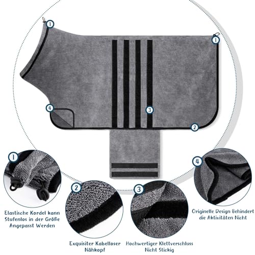 TRATTAMENTO DI ALTA QUALITÀ: I bordi del nostro accappatoio per cani sono cuciti in più strati. Grazie al velcro di alta qualità, il cane può facilmente mettere l'accappatoio e regolare la tenuta. L'asciugamano per cani non si blocca nel velcro e non si danneggia facilmente.