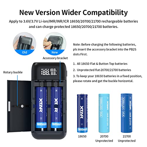 XTAR Caricabatteria agli ioni di litio aggiornato PB2S 2023, che supporta sia batterie protette 21700 che batterie ricaricabili 18650. Caricabatteria e caricabatterie doppio 18650 più sicuro e affidabile per batterie 21700. (La confezione non include alcuna batteria)