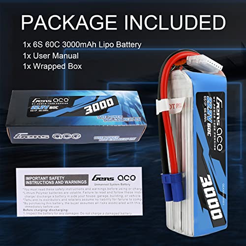 【Specifiche della batteria Lipo Gens Ace 6S 22.2V 3000mAh】:Tensione batteria: 22,2V, Configurazione: 6S, Capacità: 3000mAh, Scarica: 60C, Connettore: connettore EC5.