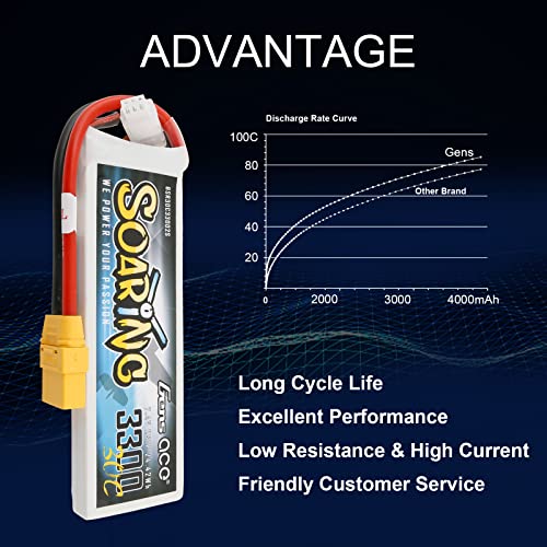 【Batteria ad alta capacità】: batteria Lipo Gens Ace 2S 7,4 V 3300 mAh a piena capacità / lunga durata. Risparmia energia per un tempo di volo più lungo. Offri prestazioni elevate e prolunga la durata della batteria per il tuo modello RC.