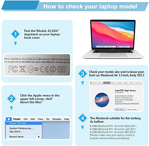 Batteria A1286 A1382 per MacBook Pro 15" [SOLO per Inizio/Fine 2011 2012 Anni] - Unibody Compatibile per MacBook PRO 8,2 9,1 A1382 [10,95V/5200mAh]