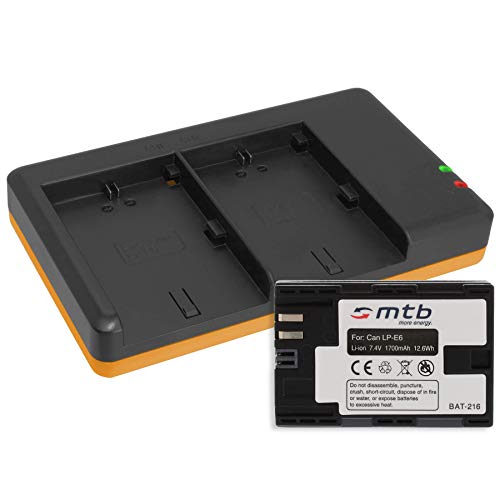 Batteria + Caricabatteria doppio (USB) per Canon LP-E6(N) / EOS 5D Mark II, III, IV / 6D, 7D II, 60D(a), 70D, 80D / XC-10 / WTF-E5, E7... - v. lista (Cavo USB micro incluso)