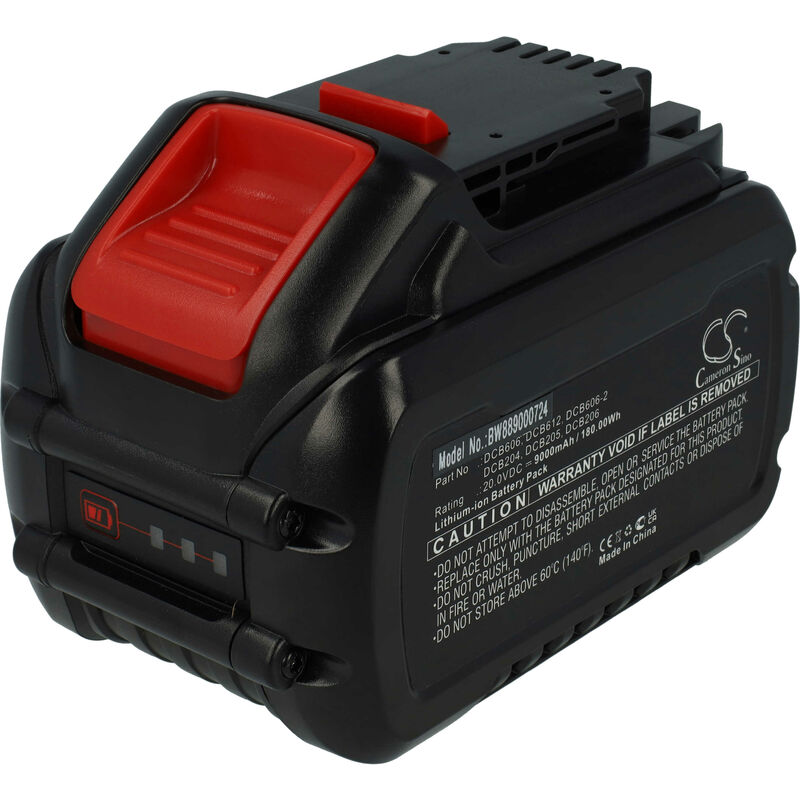 Vhbw - the clever way - Batteria ricaricabile di ricambio, compatibile e di alta qualità, ad alta capacità, per strumenti da lavoro come trapani, levigatrici, smerigliatrici, avvitatori elettrici, reggiatrici, radio, seghe e tagliaerba - È adatta anche come batteria di riserva - Le nostre batterie soddisfano tutte le principali norme di sicurezza operativa Accessorio compatibile di alta qualità ad alte prestazioni di vhbw. CONTENUTO DELLA SPEDIZIONE: - 1x batteria SPECIFICHE TECNICHE: - Peso: 1300 g - Tecnologia: Li-Ion - senza effetto memoria - Capacità: 9000 mAh - Tensione: 20 V - Energia: 180 Wh - Colore: nero / rosso - Numero di celle: 6 - Con indicatore di carica a LED - Dimensioni: 13,8 x 9,7 x 8,5 cm COMPATIBILE CON: - Dewalt DCF610 - Dewalt DCF610S2 - Dewalt DCE089D1G-QW - Dewalt DCE089D1R-QW - Dewalt DCF610D2-QW - Dewalt DCF620 Per garantire la compatibilità, verificare se la batteria ricaricabile attualmente in uso è presente nell'elenco. SOSTITUISCE: - Dewalt DCB102
