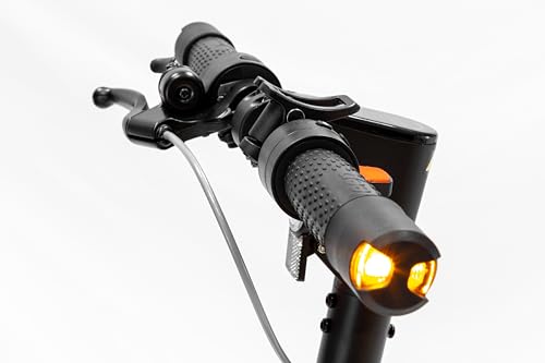 Questo e-scooter è dotato di freni su entrambe le ruote, di un cicalino, di indicatori di direzione e di luci anteriori bianche o gialle e di luci posteriori rosse