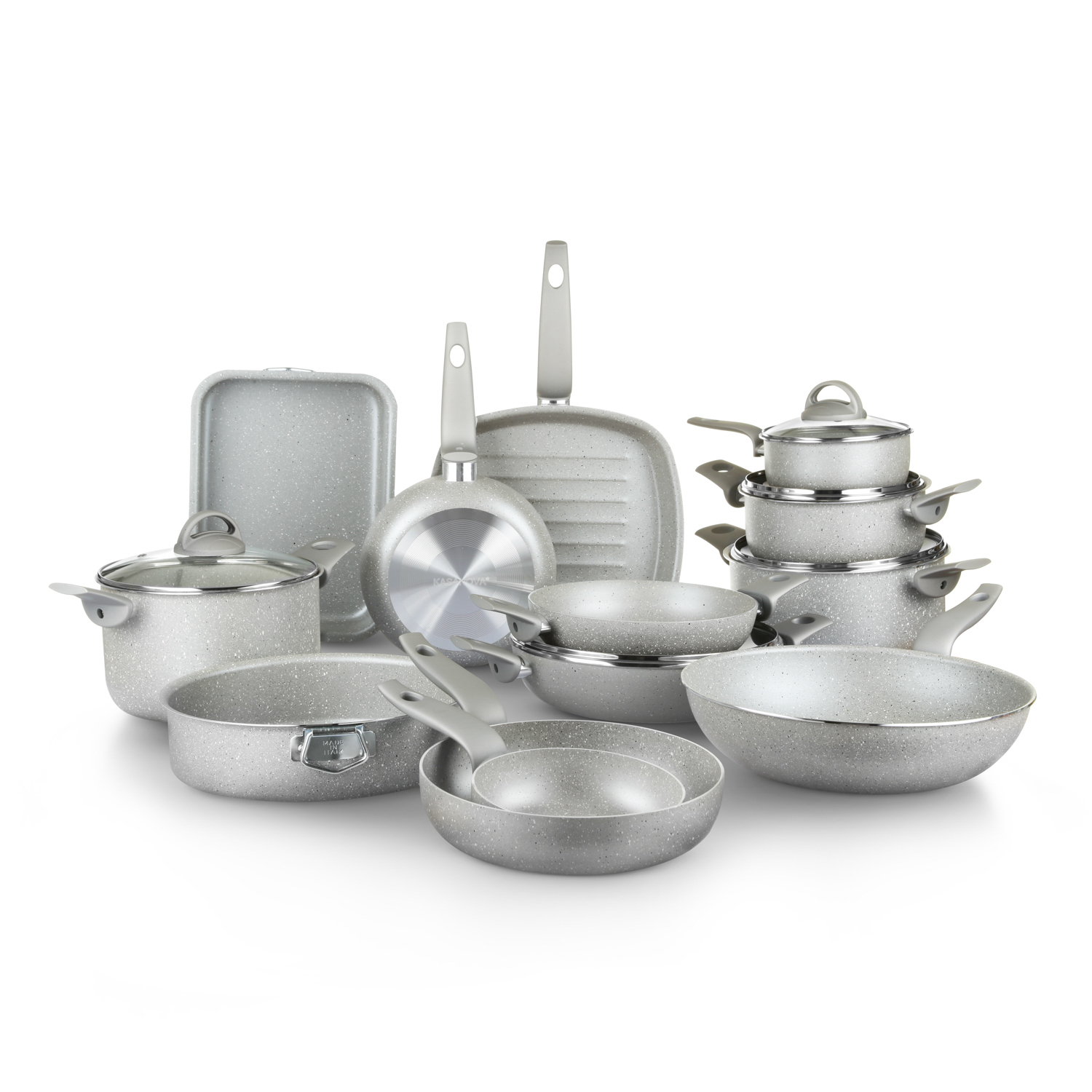 Una sola batteria per cucinare una moltitudine di ricette per tutta la famiglia, sia in forno che sul fuoco. Un vero e proprio kit completo totalmente italiano e dotato di rivestimento Greblon CR con lavorazione Major Pietratech antiaderente 6 strati a base d'acqua. Libero da PFOA, Nichel, Cadmio, Genx e altri metalli pesanti, questo rivestimento antiaderente assicura massimo rispetto per l'ambiente e sicurezza per la salute del consumatore. Con manici e pomoli in bachelite soft touch, che garantiscono una presa salda e sicura, questa batteria è ideale per una cucina dietetica e sana senza grassi aggiunti. Composta da 3 casseruole, 1 pentola, 3 padelle, 1 wok, 2 tegami, 1 bistecchiera, 2 teglie da forno e 5 coperchi. Non adatta all'induzione, si consiglia il lavaggio a mano per preservare la finitura dei manici.