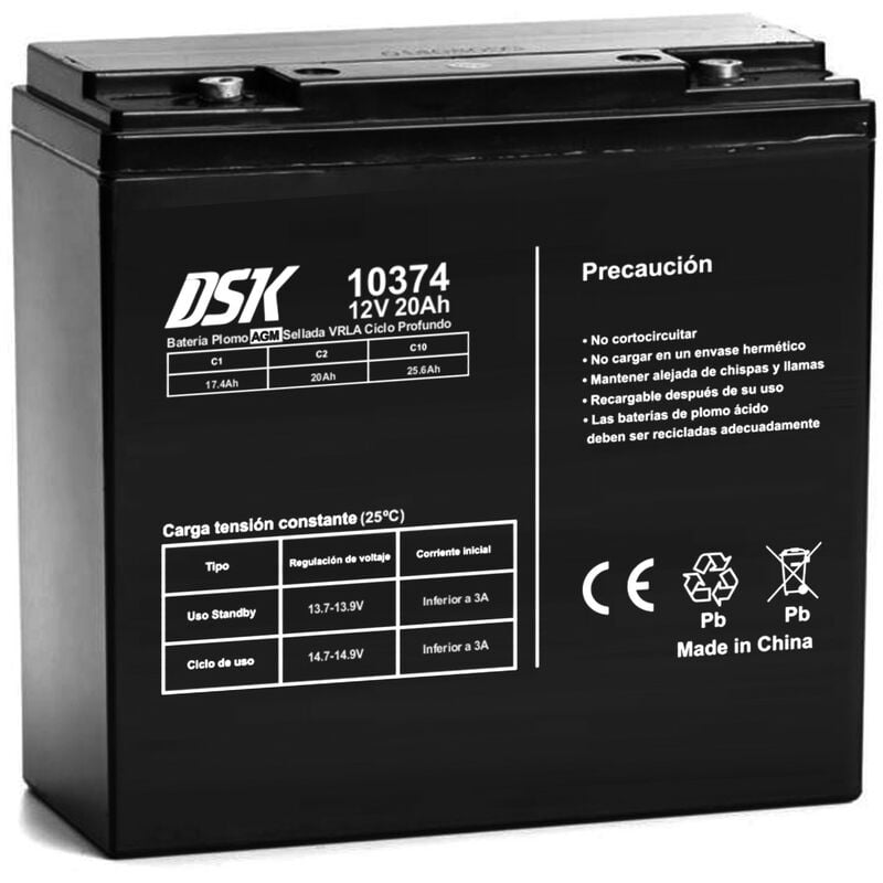 Batteria a ciclo profondo LEAD 12Vdc 20h VEICOLI DSK Tensione 12V Potenza 20Ah Dimensioni: Lunghezza 181 mm Larghezza 77mm Altezza totale 170 mm Corrente massima di carica 1,8Ah Peso 6,75 Kg Terminali a presa M5 APPLICAZIONI PER L'USO VEICOLI, carrelli da golf, sedie per disabili, elettroutensili, tosaerba, ecc. Elevate prestazioni di resistenza alla corrosione: griglia multi-lega Pb-Ca Alta densità di energia e di potenza Eccellente capacità di accettazione del carico Elevate prestazioni ad alta e bassa temperatura Capacità di scarica istantanea ad alta corrente ottimizzata Basso tasso di autoscarica Eccellente durata dei cicli di scarica profonda La durata progettata è di3-5 anni Veicolo elettrico
