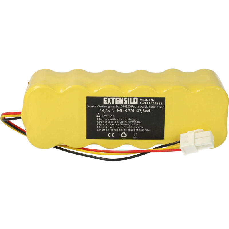 Batteria ricaricabile di ricambio, compatibile e di alta qualità, ad alta capacità, per robot aspirapolvere o robot / dispositivo per la pulizia della casa (Può trovare tutti i modelli corrispondenti qui di seguito) - La batteria può essere caricata con il Suo caricabatterie standard o con uno compatibile - Le nostre batterie ricaricabili soddisfano tutti i requisiti rilevanti per la sicurezza operativa Inoltre, nelle nostre offerte è possibile trovare cartucce profumate, per profumare l'ambiente mentre si usa l'aspirapolvere o il robot aspirapolvere. CONTENUTO DELLA SPEDIZIONE: - 1x batteria ricaricabile SPECIFICHE TECNICHE: - Tecnologia: NiMH - Capacità: 3300 mAh - Tensione: 14,4 V - Energia: 47,5 Wh - Numero di celle: 12 - Peso: 480 g - Dimensioni (Lung. x Larg. x Alt.): 13,6 x 4,6 x 4,5 cm Per garantire la compatibilità, verificare se la batteria ricaricabile attualmente in uso è presente nell'elenco. SOSTITUISCE: - Samsung AP5576883, DJ96-00113C, DJ63-01050A, AP5579205