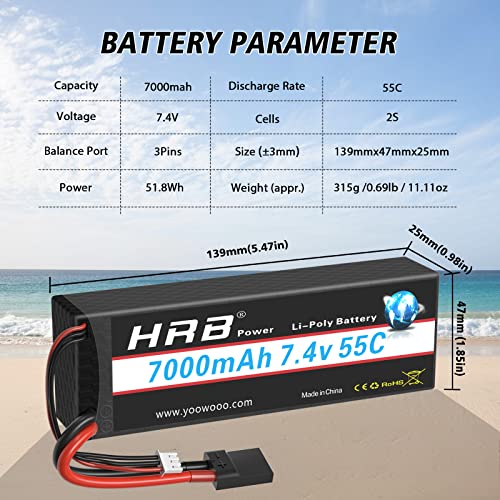 HRB - Batteria Lipo 7000 mAh 7.4 V 55C 2S RC con spina TR, batteria di ricambio per aereo, elicottero, barca, Buggy Wing RC Auto